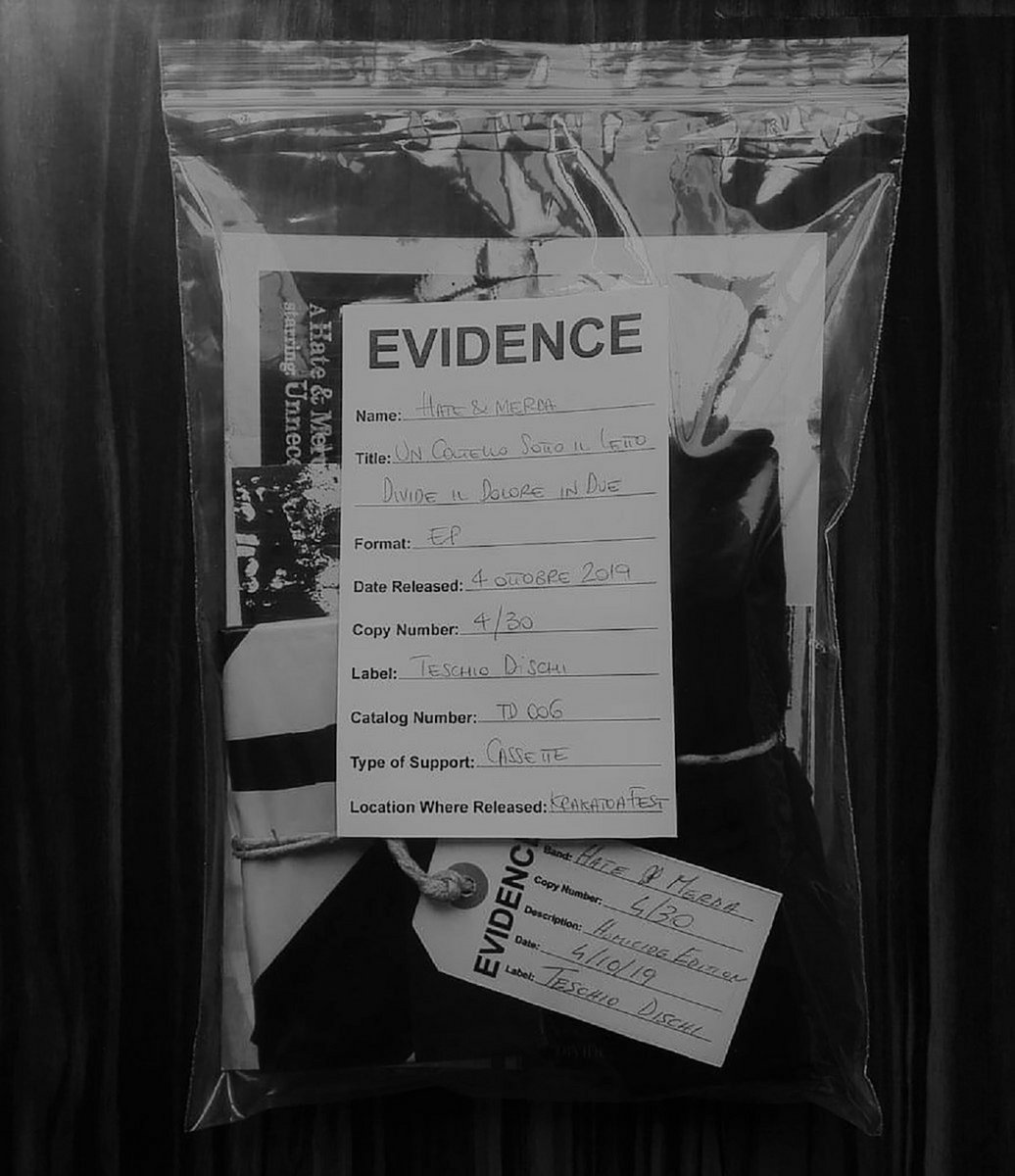 Tutti gli indizi diventano prove. Ogni singola copia è confezionata in una busta trasparente con l'indicazione di "Corpo del Reato". La busta delle prove contiene: maschera dell'assalitore, cassetta rossa rinvenuta nello stero sul luogo del crimine, coltellino inciso. 2 adesivi e numero 1 cartolina (A5). Tutto è stato singolarmente ideato per questa edizione e creato ed assemblato a mano. Il Coltello è stato inciso da Andrea Taffaro. La parte grafica e la realizzazione delle targhette, degli adesivi e delle cartoline sono opera di Deesorder. Ogni copia è numerata e timbrata a mano.